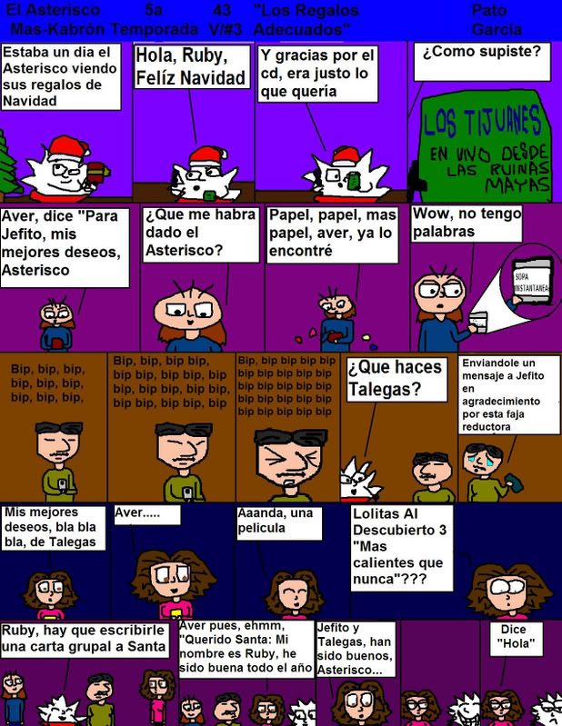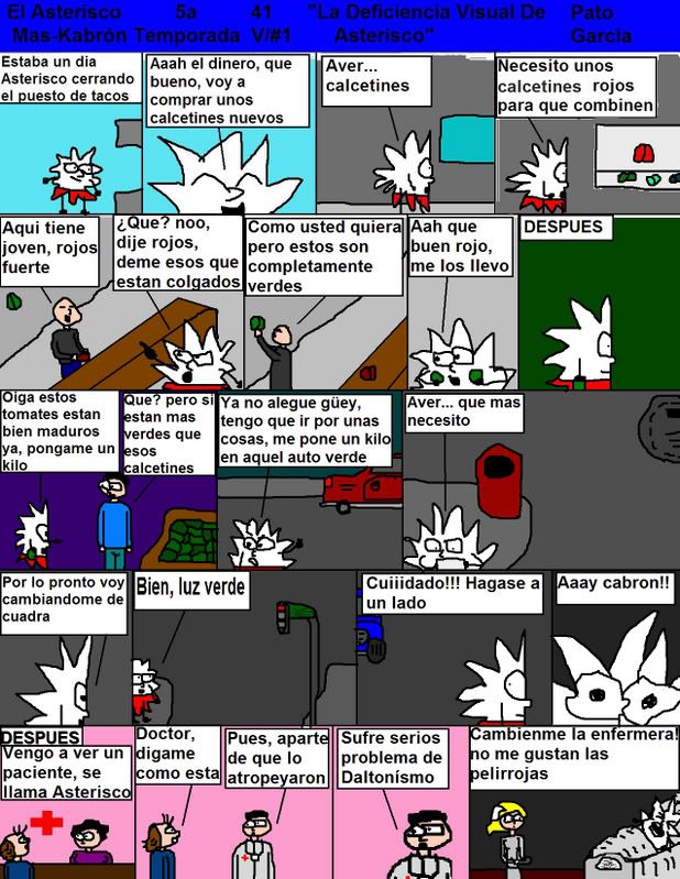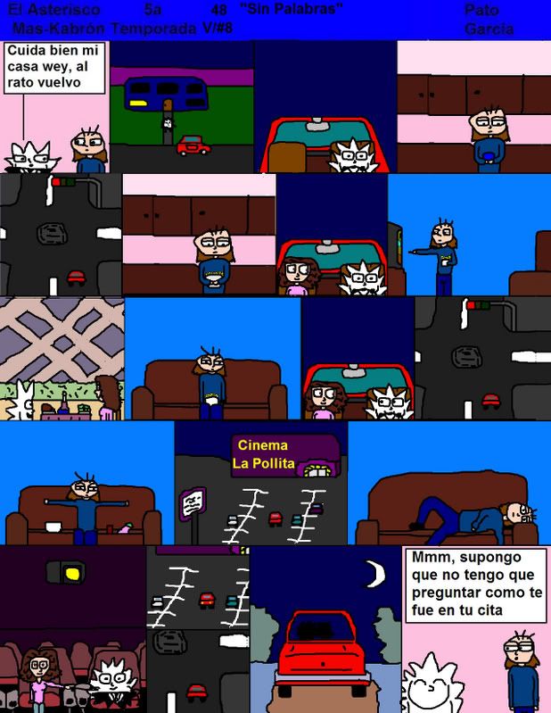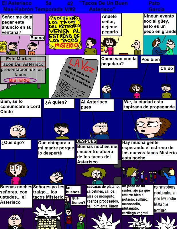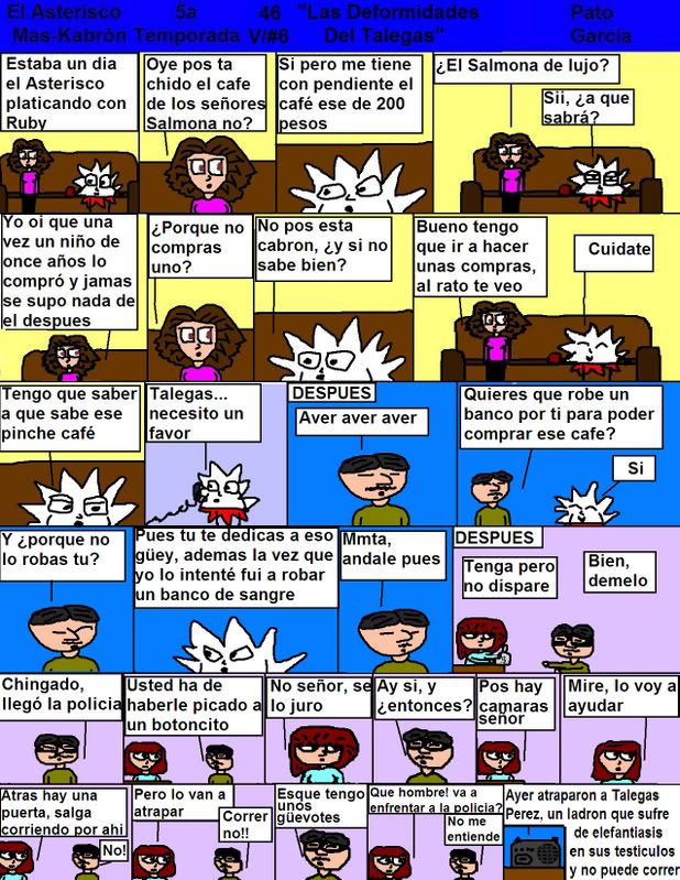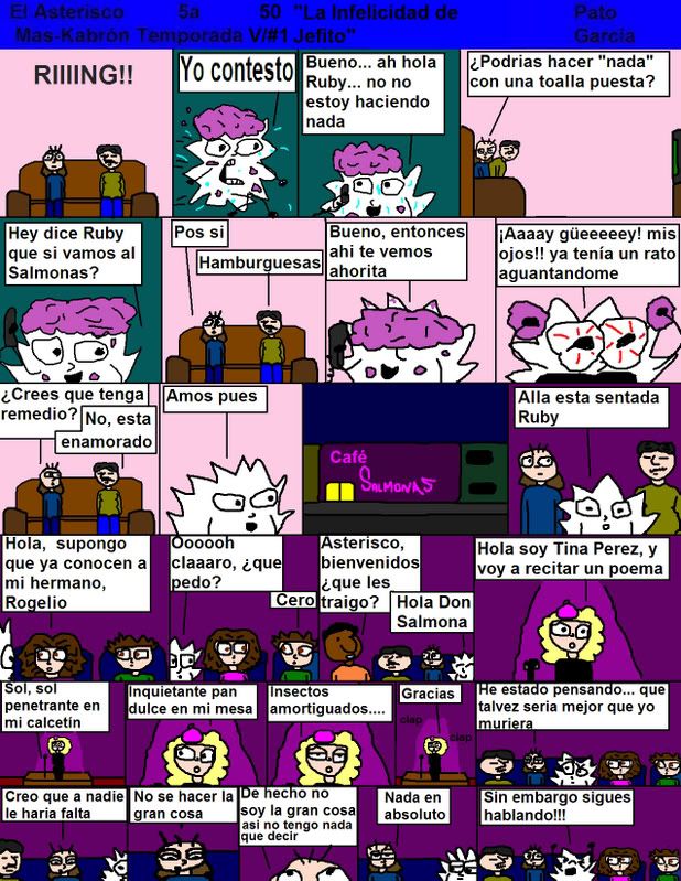 La Infelicidad De Jefito.- Asterisco y sus amigos salen al cafe de los Salmona pero al parecer Jefito entra en pensamientos profundos y trata de expresarlos-Señores hemos llegado al episodio numero 50 del Asterisco, gracias de verdad a todos los que han comentado y de alguna forma apoyado para que el comic tenga razon de seguir existiendo, el exito se lo debe a ustedes, gracias y sigan pendientes de los futuros capitulos.